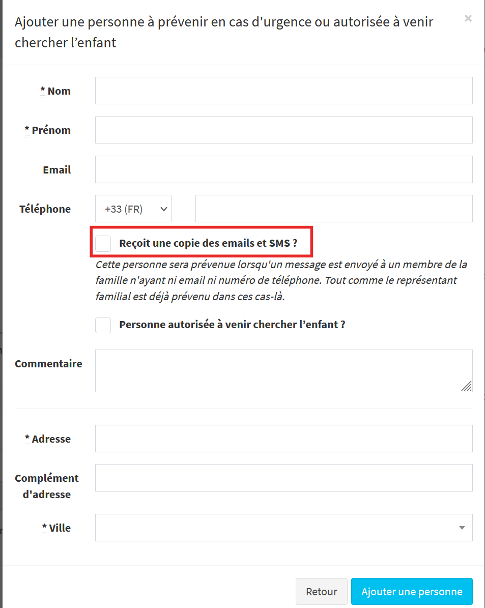 vous pouvez ajouter une ou plusieurs personnes dans une famille pour le contact mail et sms en dehors du représentant familial.