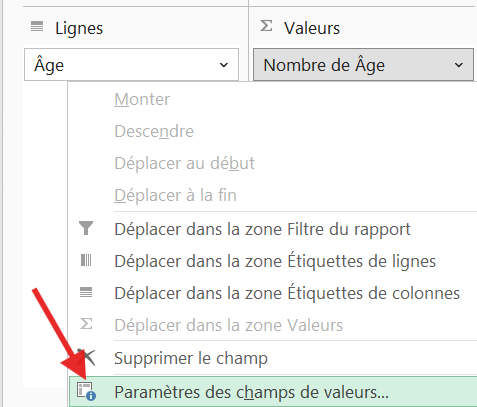 Par défaut, c'est la Somme qui est choisie. Pour modifier ce paramètre, il faut cliquer dessus et choisir "Paramètres des champs de valeurs..."