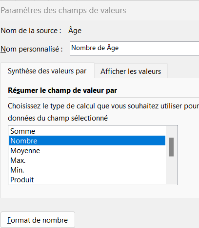 Là vous pouvez choisir la fonction dans la liste. Elles vont être plus ou moins explicites, la "Somme" va être utile pour les chiffres à cumuler (ex : une somme de montants), le "Nombre" va compter le nombre d’occurrences.
