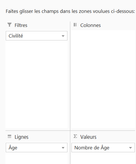 Pour notre exemple, on va faire glisser le champ "Âge" dans la zone "Lignes".