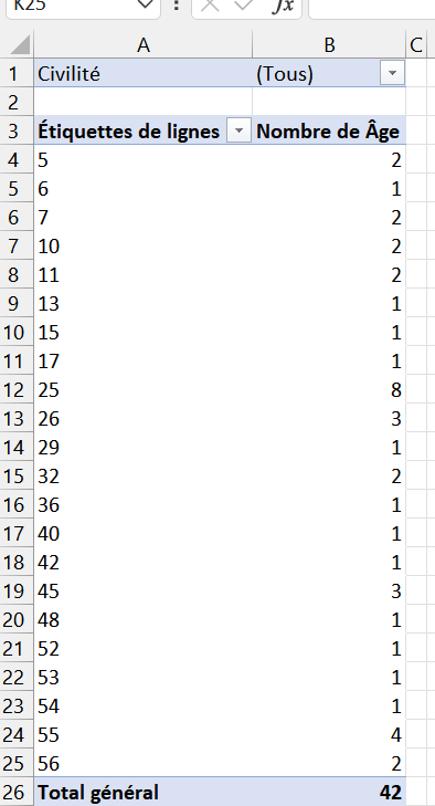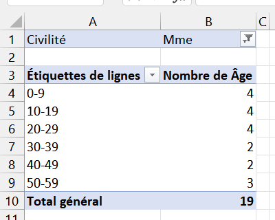 Le résultat est : "Civilité" dans la zone "Filtres", "Âge" dans la zone "Lignes" et "Nombre d'Âge" dans la zone "Valeurs"