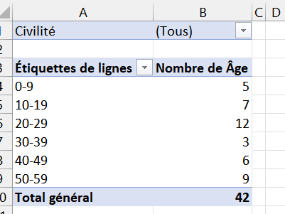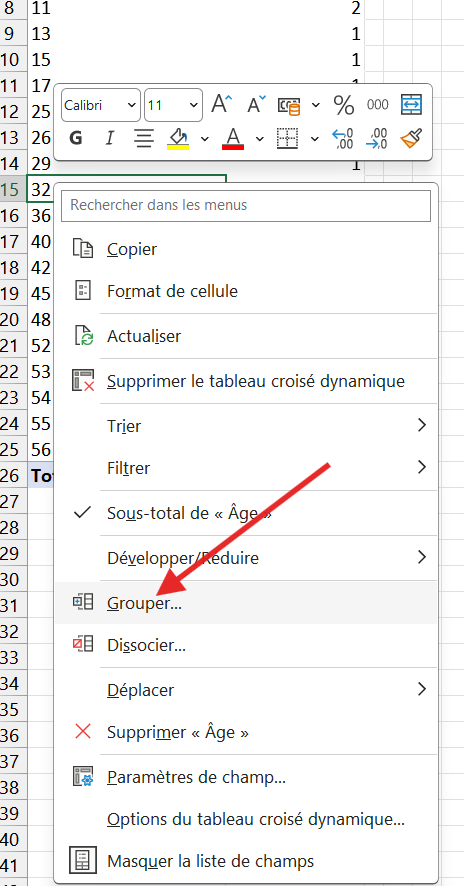 • Pour générer les tranches d'âges, il faut faire un clic droit sur l'une des valeurs de la première colonne et cliquer sur "Grouper"