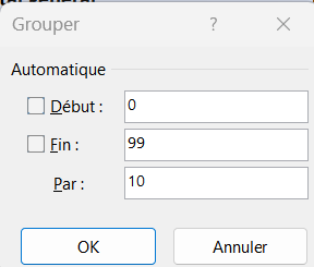 • Si je veux des tranches de 10 ans à partir de 0, je configure "Début : 0", "Fin : 99" et "Par : 10"