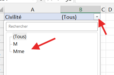 • Sur la ligne "Civilité", je peux filtrer le genre en cliquant sur la flèche à droite de "(Tous)" et en sélectionnant le critère.