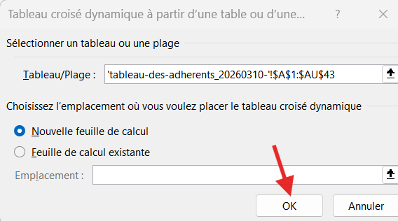 • Vous avez un menu qui permet de choisir la plage de la source et l'emplacement du tableau. Vous pouvez garder les options par défaut et cliquer sur "OK"