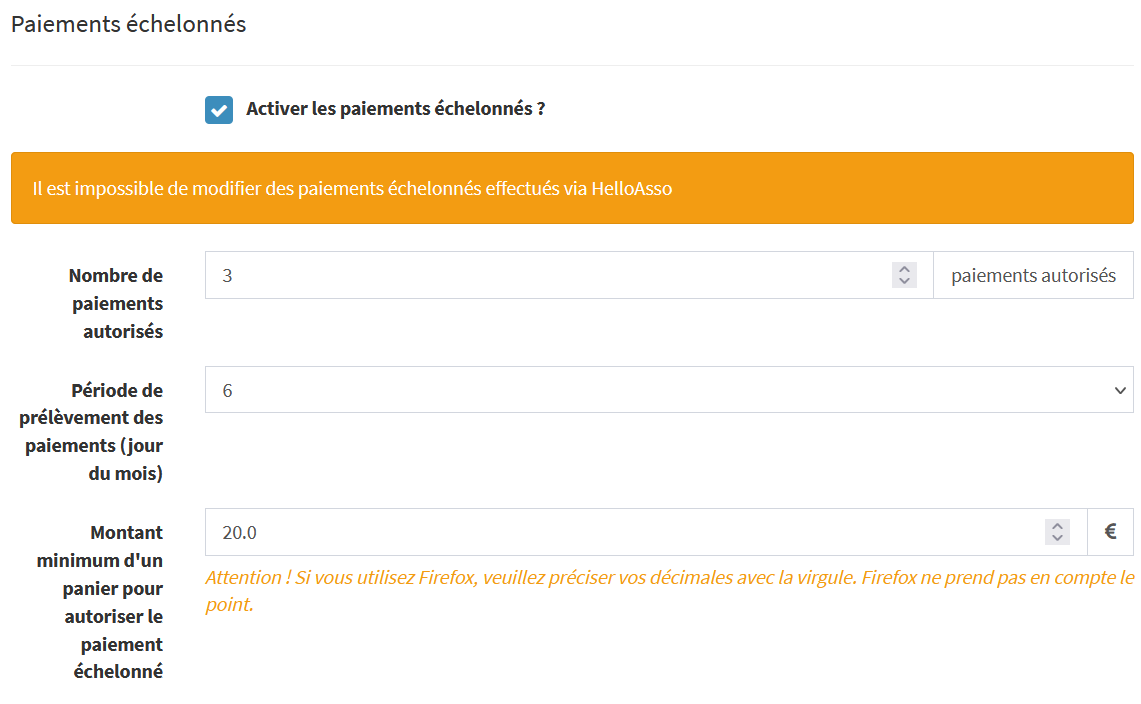 Paiements échelonnés en ligne HelloAsso comment activer ou désactiver et paramétrer.