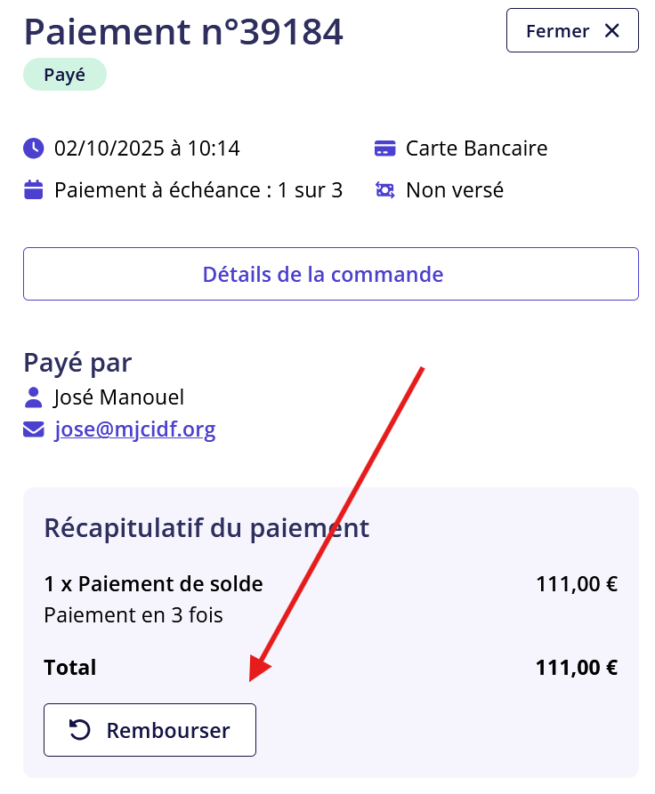 ⚠️ Important : vous ne pouvez rembourser que le montant total du paiement, les remboursements partiels ne sont pas possible.