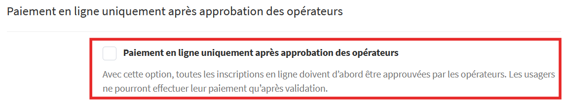 Cette option permet d’appliquer un système de préinscription à l’ensemble des inscriptions et adhésions. Autrement dit, les usagers peuvent s’inscrire, mais ne régleront leur inscription qu’une fois celle-ci validée par vos soins.