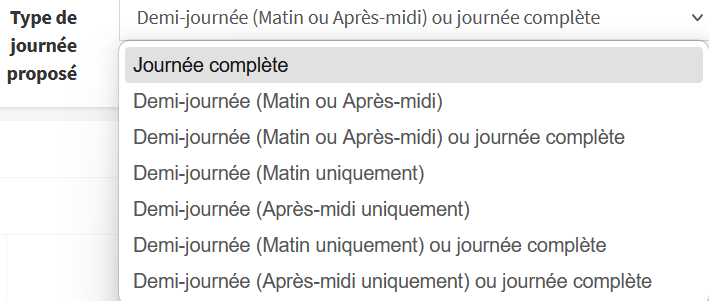 | 2. Demi-journée (matin ou après-midi) | Matin ou après-midi | Uniquement une demi-journée | Impossible de sélectionner matin + après-midi |
